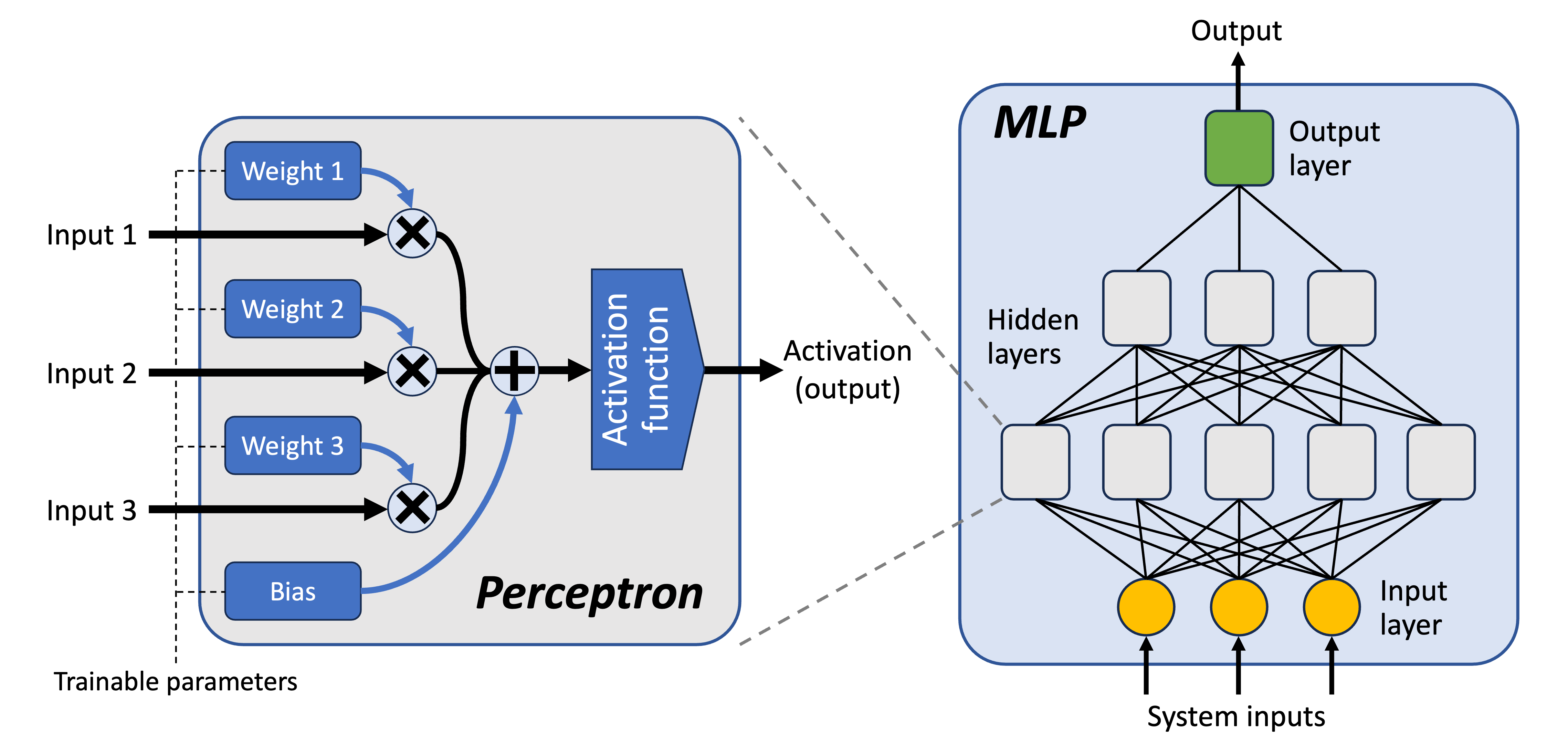 I’m going to start this series by talking about multilayer perceptrons (or MLP), which are fundamental components of most deep learning systems — or at least those based around neural networks1. Neural networks are composed of artificial neurons. A perceptron is a kind of artificial neuron, and MLP is a neural network architecture created by stacking layers of perceptrons in a feedforward fashion. They were invented by Frank Rosenblatt way back in the middle of the last century2, yet still play an important role in modern deep learning models such as transformers and convolutional neural networks (CNNs)3.