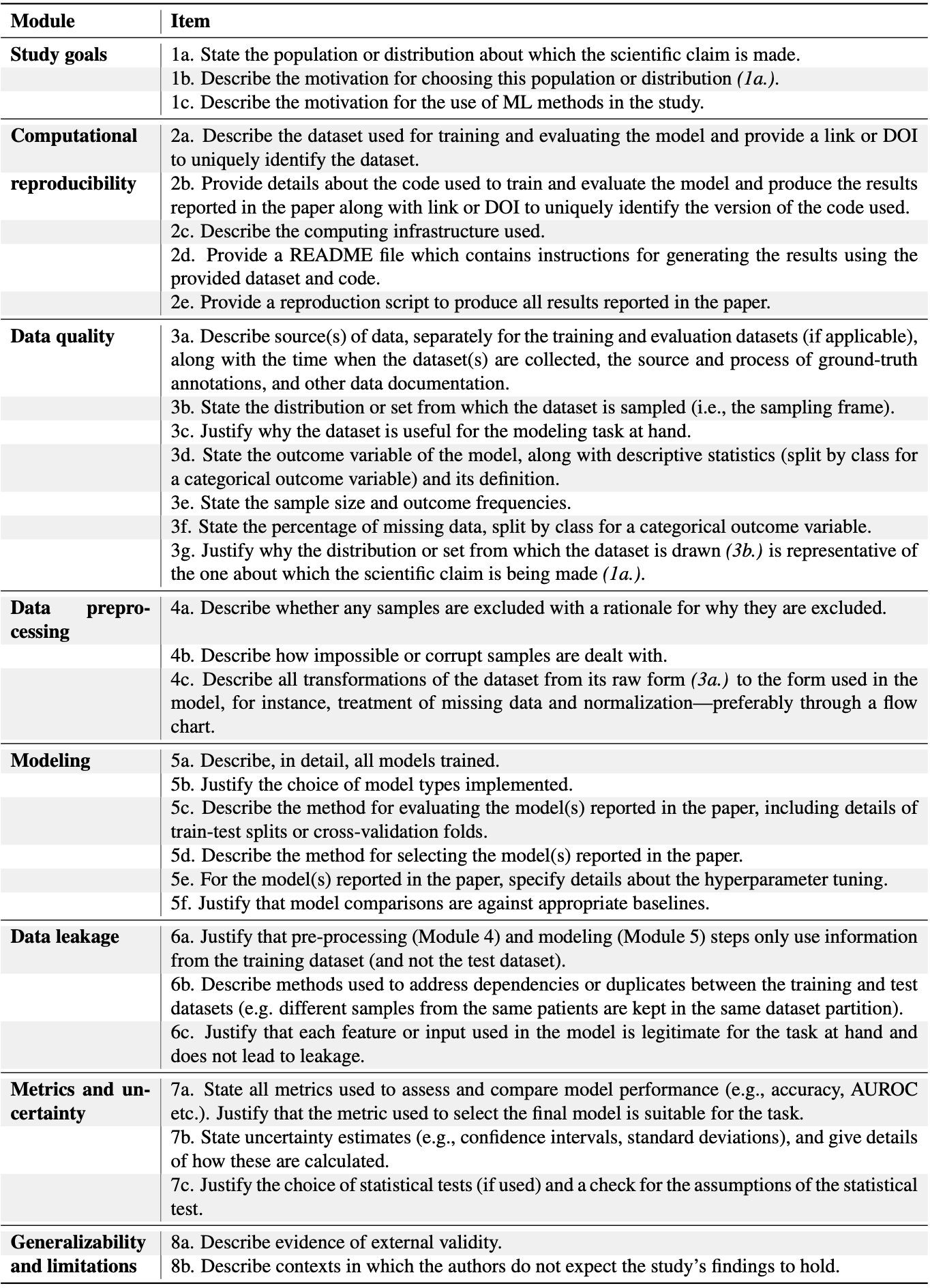 Misapplication of ML is a topic I’ve been raising for some time2, but hopefully the author list demonstrates that it’s not just me who cares about this problem. If you take a look, you’ll see authors from a string of top universities3, plus important centres of applied research such as Microsoft and the Mayo Clinic, showing that there’s broad concern about the dangers surrounding ML practice. In a nutshell, our goal is to address this problem by getting ML practitioners to reflect more on what they are doing. Whilst we don’t stipulate exactly how REFORMS should be used, some of the potential use cases are in education (informing people about how they should do ML), regulation (satisfying regulators that a product of ML is fit for purpose) and publication (satisfying reviewers that an ML pipeline described in a paper is valid).